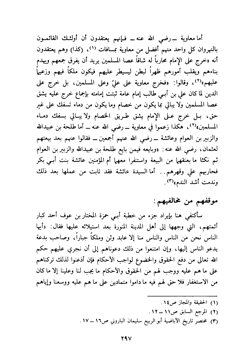 أما معاوية -رضي الله عنه- فإنهم يعتقدون أن أولئك القائمين بالنهروان, كل واحد منهم أفضل من معاوية بمسافات1، "كذا" وهم يعتقدون أنه "خرج على الإمام محاربا له, شاقا عصا المسلمين يريد أن يفرق جمعهم ويهدم بناءهم ويقلب أمورهم ظهرا لبطن؛ ليسيطر عليهم فيكون ملكا فيهم وزعيما عليهم"2، وقالوا: "فخرج معاوية على علي وعلى المسلمين، بل خرج على الدين لما كان علي بن أبي طالب إمام عامة, ثبتت إمامته بإجماع خرج عليه يشق عصا المسلمين ولا يبالي بما يكون من خصام وما يكون من دماء تسفك على غير حق، بل خرج على الإمام يشق طريق الخصام ولا يبالي بسفك دماء المسلمين"2، هكذا زعموا في معاوية -رضي الله عنه- أما طلحة بن عبيد الله والزبير بن العوام وعائشة -رضي الله عنهم أجمعين- فقالوا عنهم بعد بيعتهم لعثمان، رضي الله عنه: "وبايعه فيمن بايع طلحة بن عبيد الله والزبير بن العوام ثم نكثا ما بعنقهما من البيعة, واستنفرا معهما أم المؤمنين عائشة بنت أبي بكر, فحاربهم علي وقهرهم ... أما السيدة عائشة فقد تابت من عملها بعد ذلك, وندمت أشد الندم"3.