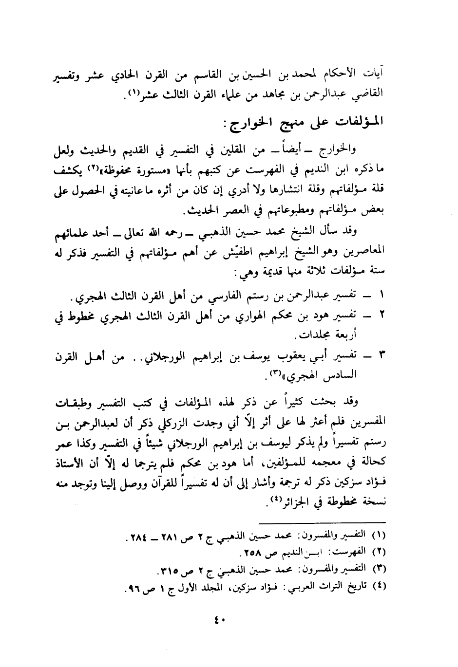 والخوارج -أيضا- من المقلين في التفسير في القديم والحديث, ولعل ما ذكره ابن النديم في الفهرست عن كتبهم بأنها "مستورة محفوظة"2 يكشف قلة مؤلفاتهم وقلة انتشارها ولا أدري إن كان من أثره ما عانيته في الحصول على بعض مؤلفاتهم ومطبوعاتهم في العصر الحديث.