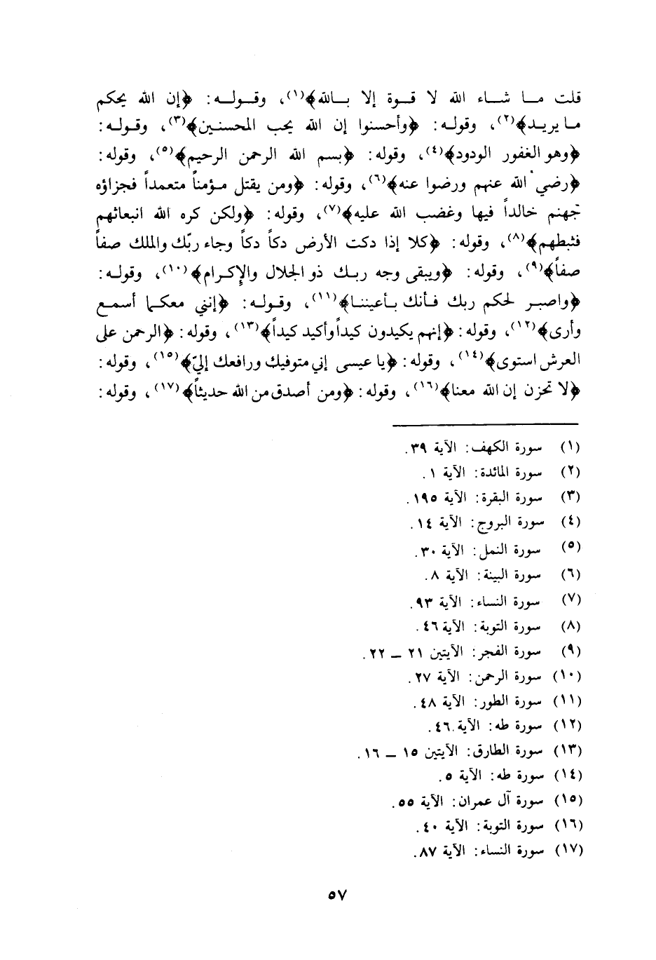 قُلْتَ مَا شَاءَ اللَّهُ لا قُوَّةَ إِلَّا بِاللَّهِ} 1، وقوله: {إِنَّ اللَّهَ يَحْكُمُ مَا يُرِيدُ} 2، وقوله: {وَأَحْسِنُوا إِنَّ اللَّهَ يُحِبُّ الْمُحْسِنِينَ} 3، وقوله: {وَهُوَ الْغَفُورُ الْوَدُودُ} 4, وقوله: {بِسْمِ اللَّهِ الرَّحْمَنِ الرَّحِيمِ} 5، وقوله: {رَضِيَ اللَّهُ عَنْهُمْ وَرَضُوا عَنْهُ} 6، وقوله: {مَنْ يَقْتُلْ مُؤْمِنًا مُتَعَمِّدًا فَجَزَاؤُهُ جَهَنَّمُ خَالِدًا فِيهَا وَغَضِبَ اللَّهُ عَلَيْهِ} 7، وقوله: {وَلَكِنْ كَرِهَ اللَّهُ انْبِعَاثَهُمْ فَثَبَّطَهُمْ} 8، وقوله: {كَلَّا إِذَا دُكَّتِ الْأَرْضُ دَكًّا دَكًّا، وَجَاءَ رَبُّكَ وَالْمَلَكُ صَفًّا صَفًّا} 9، وقوله: {وَيَبْقَى وَجْهُ رَبِّكَ ذُو الْجَلالِ وَالْإِكْرَامِ} 10، وقوله: {وَاصْبِرْ لِحُكْمِ رَبِّكَ فَإِنَّكَ بِأَعْيُنِنَا} 11، وقوله: {إِنَّنِي مَعَكُمَا أَسْمَعُ وَأَرَى} 12، وقوله: {إِنَّهُمْ يَكِيدُونَ كَيْدًا، وَأَكِيدُ كَيْدًا} 13، وقوله: {الرَّحْمَنُ عَلَى الْعَرْشِ اسْتَوَى} 14، وقوله: {يَا عِيسَى إِنِّي مُتَوَفِّيكَ وَرَافِعُكَ إِلَيَّ} 15، وقوله: {لا تَحْزَنْ إِنَّ اللَّهَ مَعَنَا} 16، وقوله: {وَمَنْ أَصْدَقُ مِنَ اللَّهِ حَدِيثًا} 17، وقوله:
