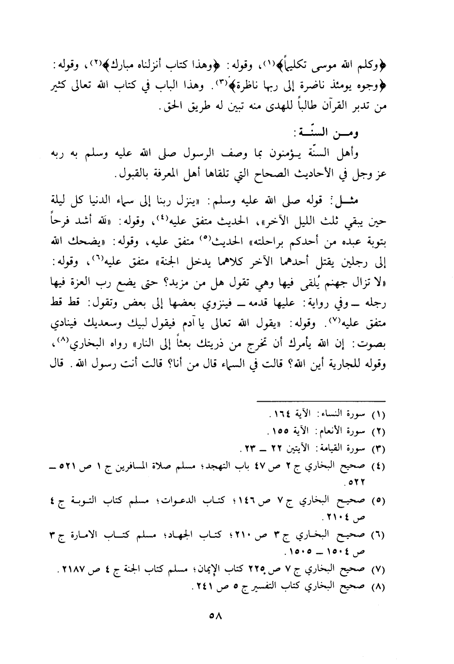 {وَكَلَّمَ اللَّهُ مُوسَى تَكْلِيمًا} 1, وقوله: {وَهَذَا كِتَابٌ أَنْزَلْنَاهُ مُبَارَكٌ} 2، وقوله: {وُجُوهٌ يَوْمَئِذٍ نَاضِرَةٌ، إِلَى رَبِّهَا نَاظِرَةٌ} 3. وهذا الباب في كتاب الله تعالى كثير, من تدبر القرآن طالبا للهدي منه, تبين له طريق الحق.