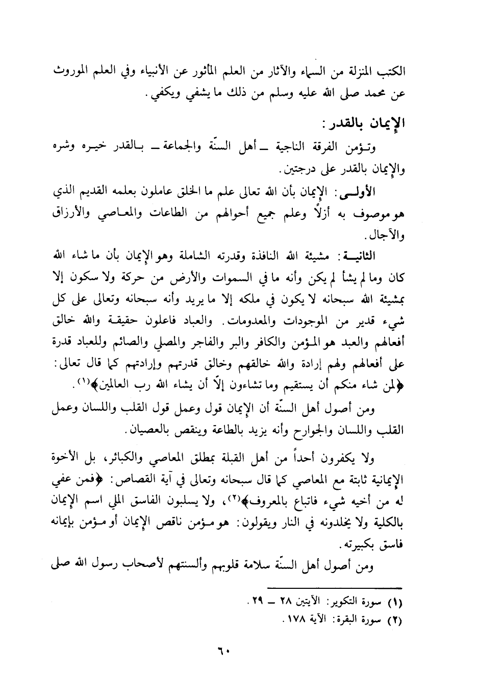 الثانية: مشيئة الله النافذة وقدرته الشاملة, وهو الإيمان بأن ما شاء الله كان وما لم يشأ لم يكن, وأنه ما في السموات والأرض من حركة ولا سكون إلا بمشيئة الله سبحانه لا يكون في ملكه إلا ما يريد وأنه سبحانه وتعالى على كل شيء قدير من الموجودات والمعدومات. والعباد فاعلون حقيقة والله خالق أفعالهم والعبد هو المؤمن والكافر, والبر والفاجر, والمصلي والصائم, وللعباد قدرة على أفعالهم ولهم إرادة, والله خالقهم وخالق قدرتهم وإرادتهم, كما قال تعالى: {لِمَنْ شَاءَ مِنْكُمْ أَنْ يَسْتَقِيمَ، وَمَا تَشَاءُونَ إِلَّا أَنْ يَشَاءَ اللَّهُ رَبُّ الْعَالَمِينَ} 1.