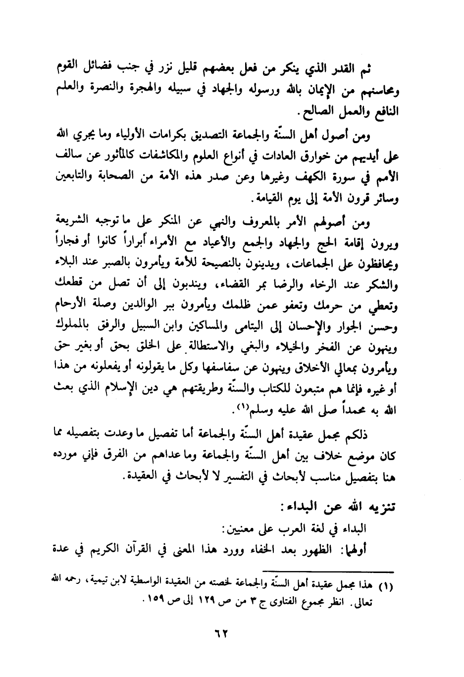 1 هذا مجمل عقيدة أهل السنة والجماعة, لخصته من العقيدة الواسطية لابن تيمية، رحمة الله تعالى. انظر مجموع الفتاوى ج3 من ص129 إلى ص159.