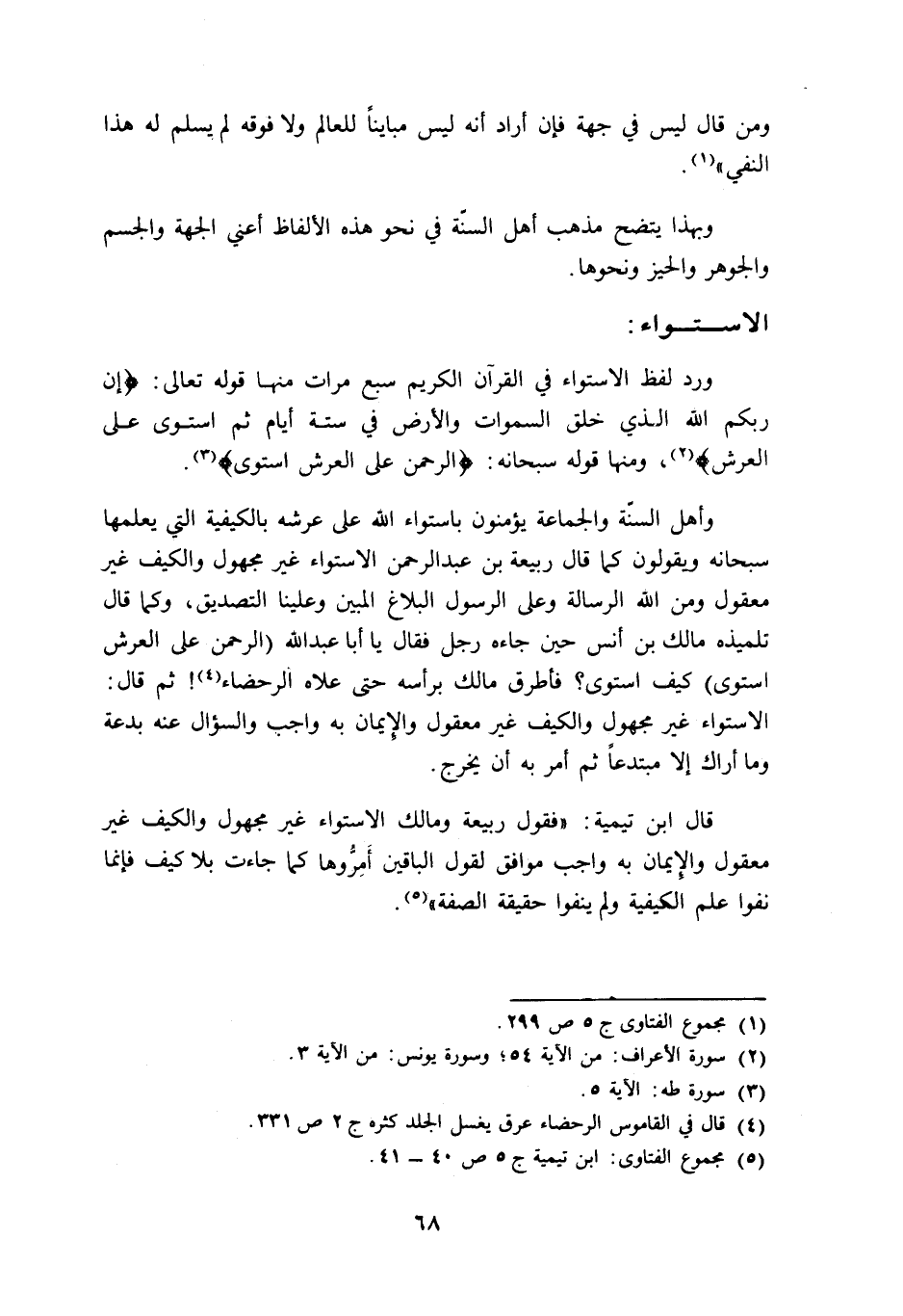 قال ابن تيمية: "فقول ربيعة ومالك: الاستواء غير مجهول والكيف غير معقول والإيمان به واجب موافق لقول الباقين, أَمِرُّوها كما جاءت بلا كيف فإنما نفوا علم الكيفية, ولم ينفوا حقيقة الصفة"5.
