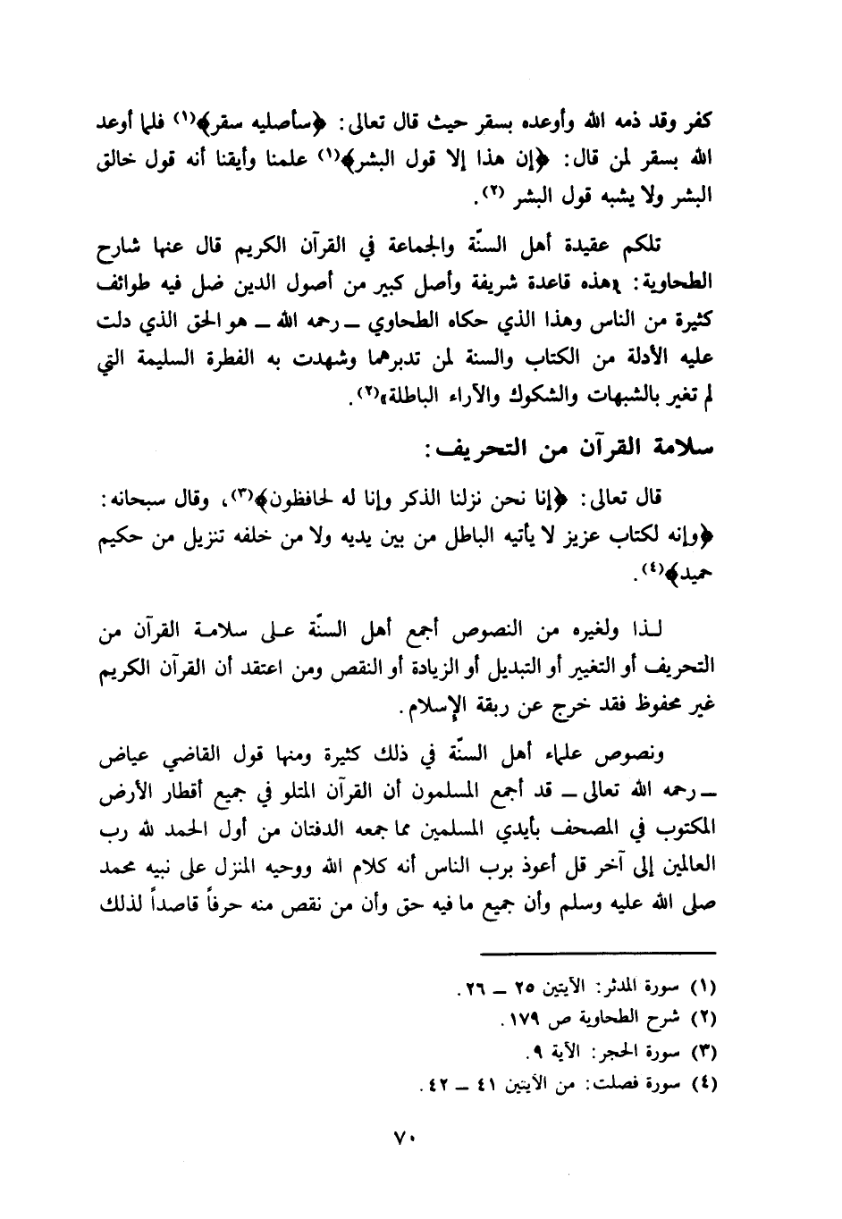 تلكم عقيدة أهل السنة والجماعة في القرآن الكريم, قال عنها شارح الطحاوية: "هذه قاعدة شريفة وأصل كبير من أصول الدين ضل فيه طوائف كثيرة من الناس, وهذا الذي حكاه الطحاوي -رحمه الله- هو الحق الذي دلت عليه الأدلة من الكتاب والسنة لمن تدبرهما, وشهدت به الفطرة السليمة التي لم تغير بالشبهات والشكوك والآراء الباطلة"2.