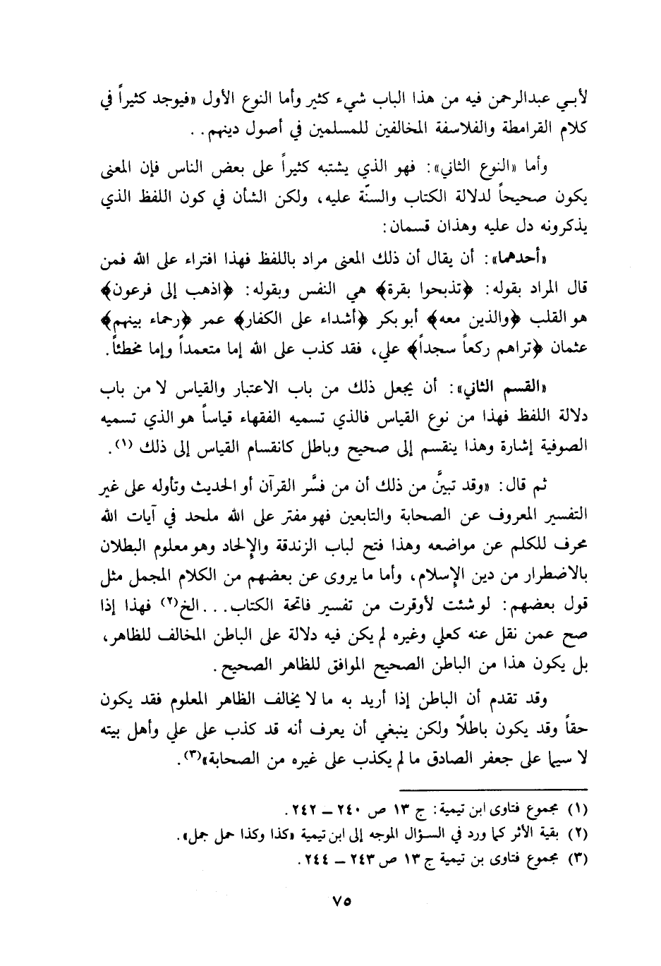 لأبي عبد الرحمن فيه من هذا الباب شيء كثير, وأما النوع الأول فيوجد كثيرا في كلام القرامطة والفلاسفة المخالفين للمسلمين في أصول دينهم.