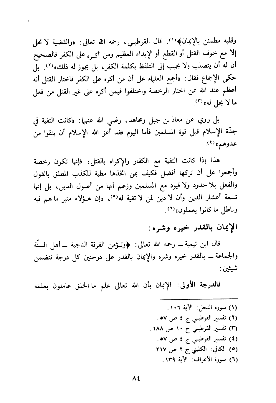 قال ابن تيمية, رحمه الله تعالى: "وتؤمن الفرقة الناجية -أهل السنة والجماعة- بالقدر خيره وشره, والإيمان بالقدر على درجتين, كل درجة تتضمن شيئين: