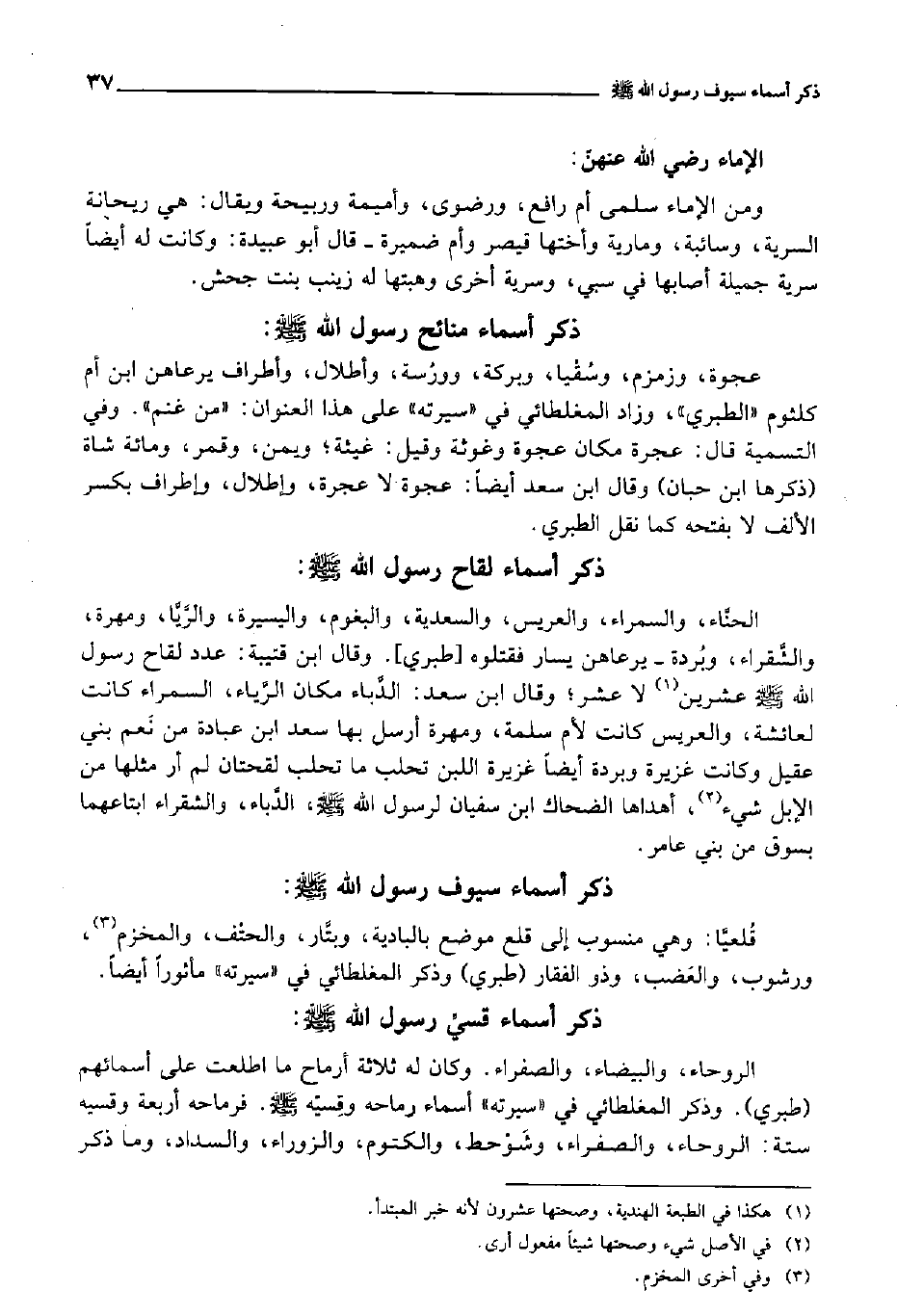 الروحاء والبيضاء والصفراء وَكَانَ لَهُ ثَلَاثَة أرماح مَا اطَّلَعت على أسمائهم طبري وَذكر المغلطائي فِي سيرته أَسمَاء رماحه وقسيه صلى الله عَلَيْهِ وَسلم فرماحه أَرْبَعَة وقسيه سِتَّة الروحاء والصفراء وشوحط والكتوم والزوراء والسداد وَمَا ذكر