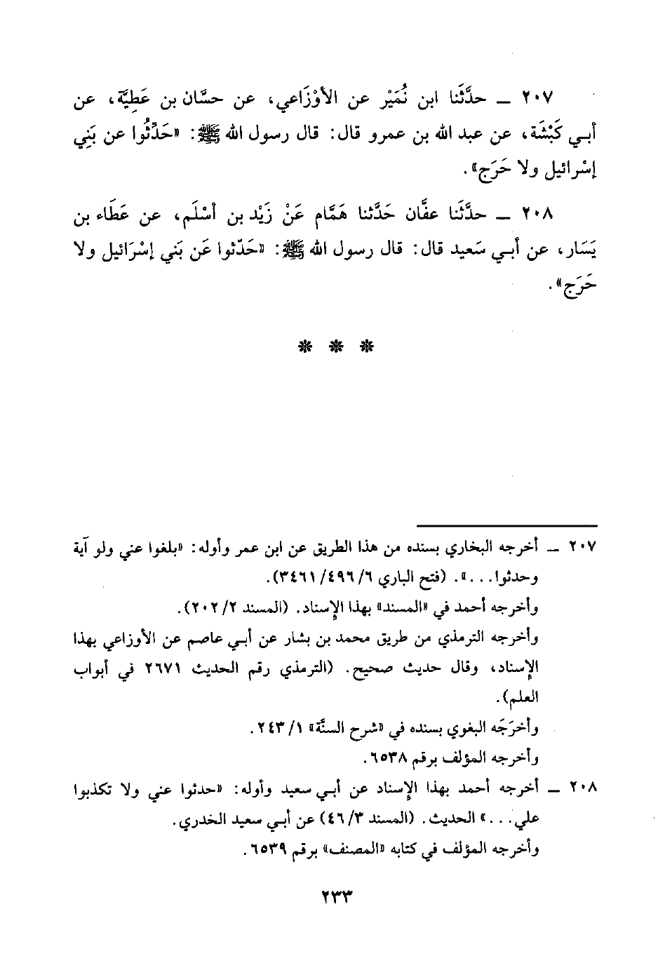 207 - حَدَّثَنَا ابْنُ نُمَيْرٍ، عَنِ الْأَوْزَاعِيِّ، عَنْ حَسَّانَ بْنِ عَطِيَّةَ، عَنْ أَبِي كَبْشَةَ، عَنْ عَبْدِ اللَّهِ بْنِ عَمْرٍو قَالَ: قَالَ رَسُولُ اللَّهِ: «§حَدِّثُوا عَنْ بَنِي إِسْرَائِيلَ وَلَا حَرَجَ»