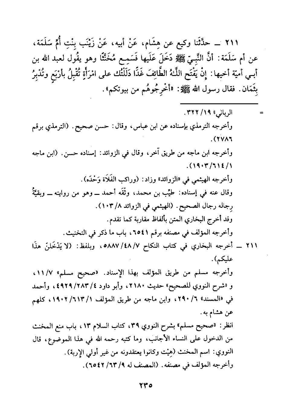 211 - حَدَّثَنَا وَكِيعٌ، عَنْ هِشَامٍ، عَنْ أَبِيهِ، عَنْ زَيْنَبَ بِنْتِ أُمِّ سَلَمَةَ، عَنْ أُمِّ سَلَمَةَ: أَنَّ النَّبِيَّ صَلَّى اللهُ عَلَيْهِ وَسَلَّمَ دَخَلَ عَلَيْهَا فَسَمِعَ مُخَنَّثًا وَهُوَ يَقُولُ لِعَبْدِ اللَّهِ بْنِ أَبِي أُمَيَّةَ أَخِيهَا: إِنْ يَفْتَحِ اللَّهُ الطَّائِفَ غَدًا دَلَلْتُكَ عَلَى امْرَأَةٍ تُقْبِلُ بِأَرْبَعٍ وَتُدْبِرُ بِثَمَانٍ. فَقَالَ رَسُولُ اللَّهِ صَلَّى اللهُ عَلَيْهِ وَسَلَّمَ: «§أَخْرِجُوهُمْ مِنْ بُيُوتِكُمْ»