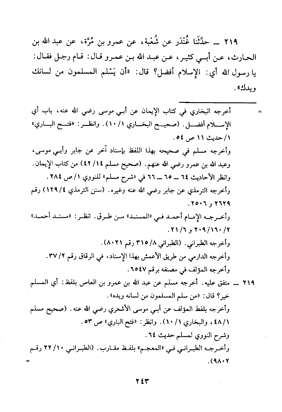 219 - حَدَّثَنَا غُنْدَرٌ، عَنْ شُعْبَةَ، عَنْ عَمْرِو بْنِ مُرَّةَ، عَنْ عَبْدِ اللَّهِ بْنِ الْحَارِثِ، عَنْ أَبِي كَثِيرٍ، عَنْ عَبْدِ اللَّهِ بْنِ عَمْرٍو، قَالَ: قَامَ رَجُلٌ، فَقَالَ: يَا رَسُولَ اللَّهِ §أَيُّ: الْإِسْلَامِ أَفْضَلُ؟، قَالَ: «أَنْ يَسْلَمَ الْمُسْلِمُونَ مِنْ لِسَانِكَ وَيَدِكَ»