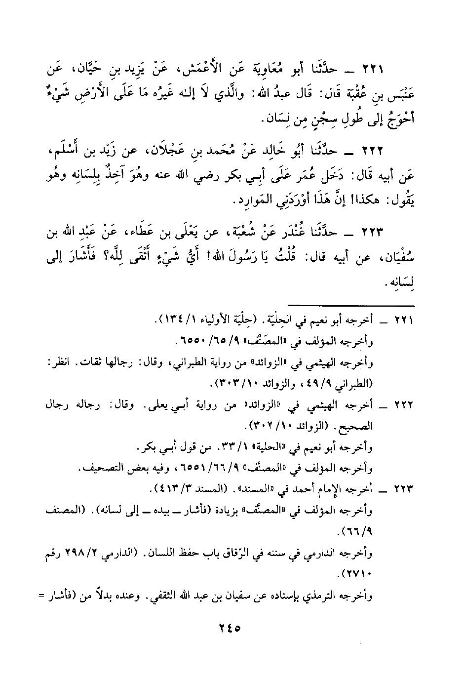 221 - حَدَّثَنَا أَبُو مُعَاوِيَةَ، عَنِ الْأَعْمَشِ، عَنْ يَزِيدَ بْنِ حَيَّانَ، عَنْ عَنْبَسِ بْنِ عُقْبَةَ، قَالَ: قَالَ عَبْدُ اللَّهِ: «وَالَّذِي لَا إِلَهَ غَيْرَهُ §مَا عَلَى الْأَرْضِ شَيْءٌ أَحْوَجُ إِلَى طُولِ سَجْنٍ مِنْ لِسَانٍ»