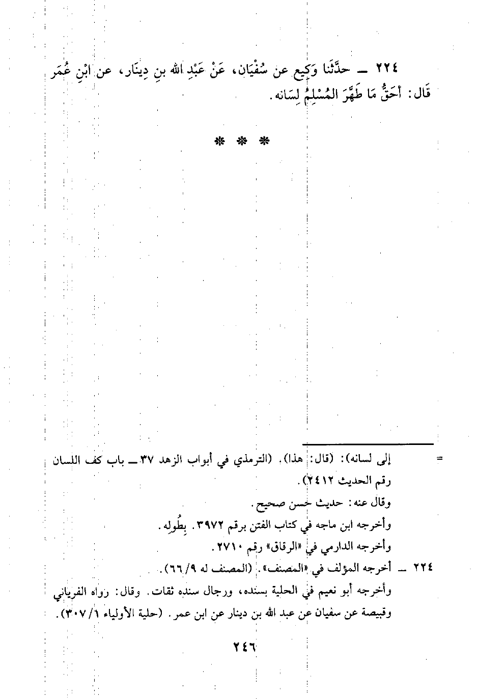 224 - حَدَّثَنَا وَكِيعٌ، عَنْ سُفْيَانَ، عَنْ عَبْدِ اللَّهِ بْنِ دِينَارٍ، عَنِ ابْنِ عُمَرَ، قَالَ: «§أَحَقُّ مَا طَهَّرَ الْمُسْلِمُ لِسَانُهُ»