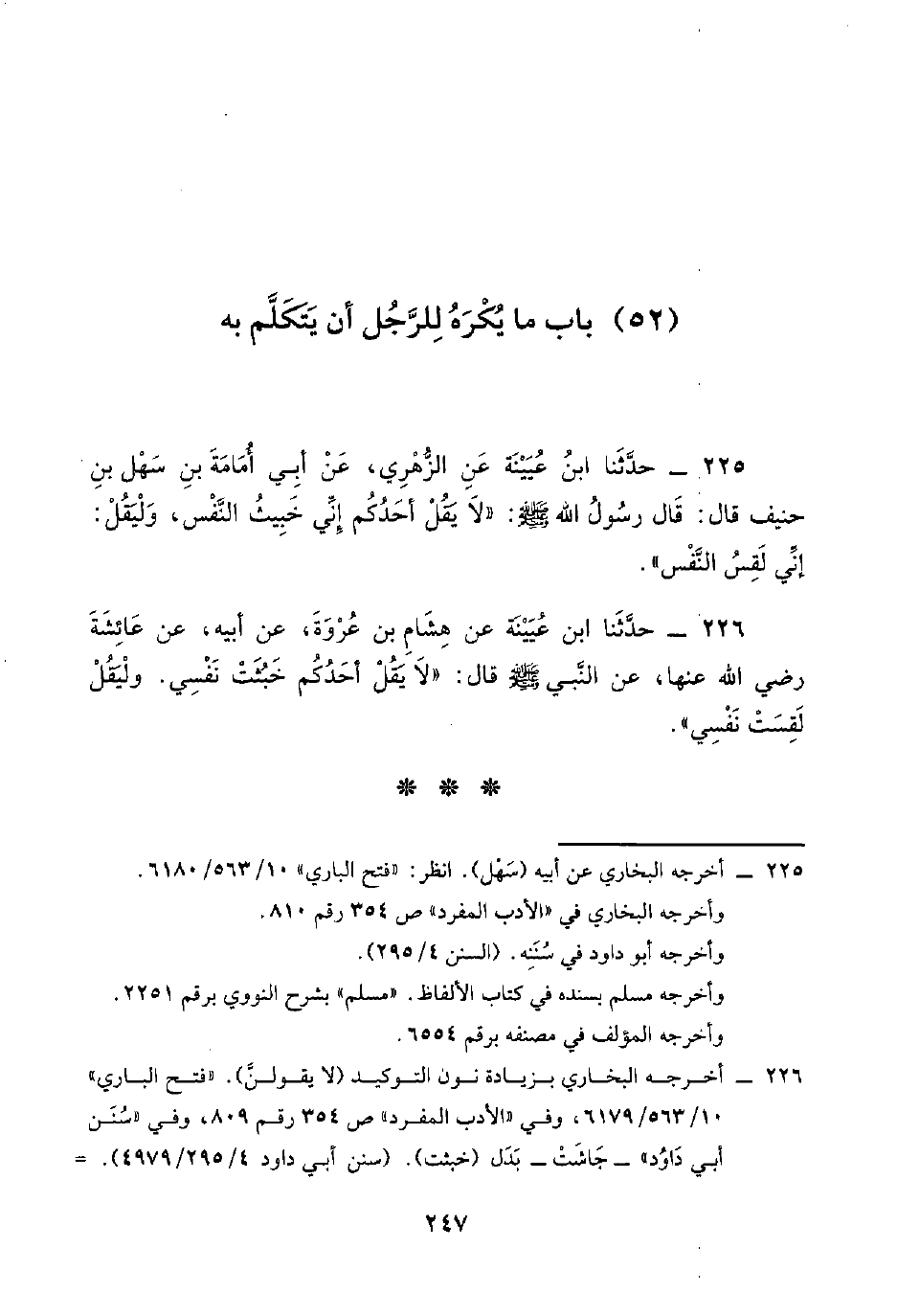 225 - حَدَّثَنَا ابْنُ عُيَيْنَةَ، عَنِ الزُّهْرِيِّ، عَنْ أَبِي أُمَامَةَ بْنِ سَهْلِ بْنِ حُنَيْفٍ، قَالَ: قَالَ رَسُولُ اللَّهِ صَلَّى اللهُ عَلَيْهِ وَسَلَّمَ: " §لَا يَقُلْ أَحَدُكُمْ إِنِّي خَبِيثُ النَّفْسِ، وَلْيَقُلْ: إِنِّي لَقِسُ النَّفْسِ "