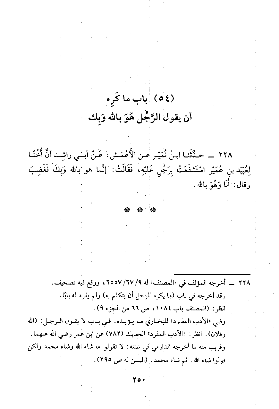 228 - حَدَّثَنَا ابْنُ نُمَيْرٍ، عَنِ الْأَعْمَشِ، عَنْ أَبِي رَاشِدٍ: أَنَّ أُخْتًا لِعُبَيْدِ بْنِ عُمَيْرٍ اسْتَشْفَعَتْ بِرَجُلٍ عَلَيْهِ، فَقَالَتْ: §إِنَّمَا هُوَ بِاللَّهِ وَبِكَ. فَغَضِبَ، وَقَالَ: «أَنَا وَهُوَ بِاللَّهِ»