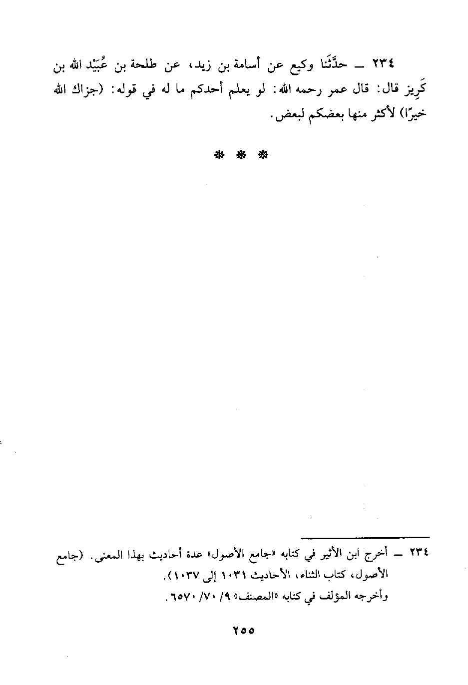 234 - حَدَّثَنَا وَكِيعٌ، عَنْ أُسَامَةَ بْنِ زَيْدٍ، عَنْ طَلْحَةَ بْنِ عُبَيْدِ اللَّهِ بْنِ كُرَيْزٍ، قَالَ: قَالَ عُمَرُ رَحِمَهُ اللَّهُ: §لَوْ يَعْلَمُ أَحَدُكُمْ مَا لَهُ فِي قَوْلِهِ: جَزَاكَ اللَّهُ خَيْرًا لَأَكْثَرَ مِنْهَا بَعْضُكُمْ لِبَعْضٍ