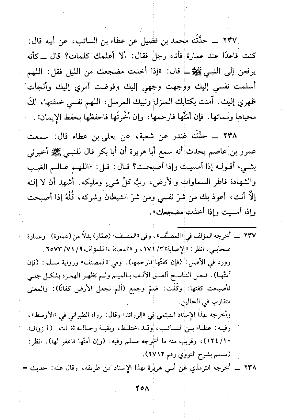 237 - حَدَّثَنَا مُحَمَّدُ بْنُ فُضَيْلٍ، عَنْ عَطَاءِ بْنِ السَّائِبٍ، عَنْ أَبِيهِ، قَالَ: كُنْتُ قَاعِدًا عِنْدَ عُمَارَةَ، فَأَتَاهُ رَجُلٌ، فَقَالَ: أَلَا أُعَلِّمُكَ كَلِمَاتٍ؟، قَالَ - كَأَنَّهُ يَرْفَعُهُ إِلَى النَّبِيِّ صَلَّى اللهُ عَلَيْهِ وَسَلَّمَ - قَالَ: " §إِذَا أَخَذْتَ مَضْجَعَكَ مِنَ اللَّيْلِ فَقُلِ: اللَّهُمَّ أَسْلَمْتُ نَفْسِيَ إِلَيْكَ، وَوَجَّهْتُ وَجْهِيَ إِلَيْكَ، وَفَوَّضْتُ أَمْرِيَ إِلَيْكَ، وَأَلْجَأْتُ ظَهْرِيَ إِلَيْكَ، آمَنْتُ بِكِتَابِكَ الْمُنَزَّلِ، وَنَبِيِّكَ الْمُرْسَلِ، اللَّهُمَّ نَفْسِيَ خَلَقْتَهَا، لَكَ مَحْيَاهَا وَمَمَاتُهَا فَإِنْ أَمَتَّهَا فَارْحَمْهَا، وَإِنْ أَخَّرْتَهَا فَاحْفَظْهَا بِحِفْظِ الْإِيمَانِ "