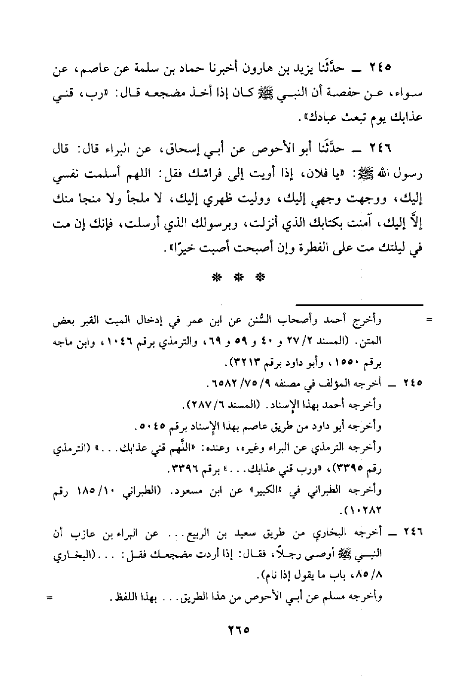 246 - حَدَّثَنَا أَبُو الْأَحْوَصِ، عَنْ أَبِي إِسْحَاقَ، عَنِ الْبَرَاءِ، قَالَ: قَالَ رَسُولُ اللَّهِ صَلَّى اللهُ عَلَيْهِ وَسَلَّمَ: " يَا فُلَانُ §إِذَا أَوَيْتَ إِلَى فِرَاشِكَ فَقُلِ: اللَّهُمَّ أَسْلَمْتُ نَفْسِي إِلَيْكَ، وَوَجَّهْتُ وَجْهِيَ إِلَيْكَ، وَوَلَّيْتُ ظَهْرِي إِلَيْكَ، لَا مَلْجَأَ وَلَا مَنْجَا مِنْكَ إِلَّا إِلَيْكَ، آمَنْتُ بِكِتَابِكَ الَّذِي أَنْزَلْتَ، وَبِرَسُولِكَ الَّذِي أَرْسَلْتَ، فَإِنَّكَ إِنْ مِتَّ فِي لَيْلَتِكَ مِتَّ عَلَى الْفِطْرَةِ، وَإِنْ أَصْبَحْتَ أَصْبَحْتَ خَيْرًا "