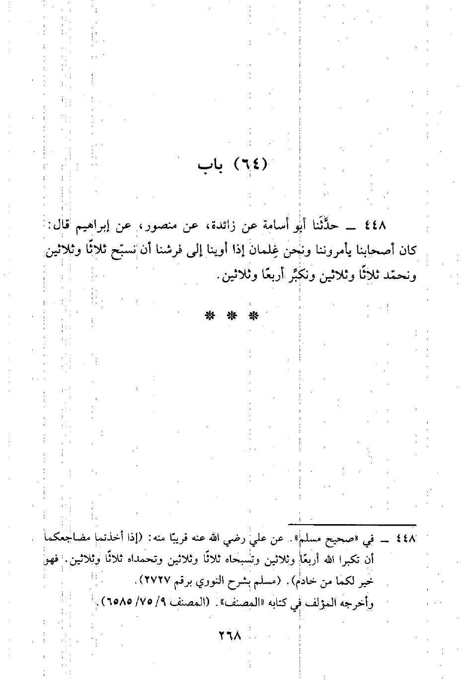 حَدَّثَنَا أَبُو أُسَامَةَ، عَنْ زَائِدَةَ، عَنْ مَنْصُورٍ، عَنْ إِبْرَاهِيمَ، قَالَ: «§كَانَ أَصْحَابُنَا يَأْمُرُونَنَا وَنَحْنُ غِلْمَانٌ إِذَا أَوَيْنَا إِلَى فُرُشِنَا أَنْ نُسَبِّحَ ثَلَاثًا وَثَلَاثِينَ، وَنَحْمَدَ ثَلَاثًا وَثَلَاثِينَ، وَنُكَبِّرَ أَرْبَعًا وَثَلَاثِينَ»