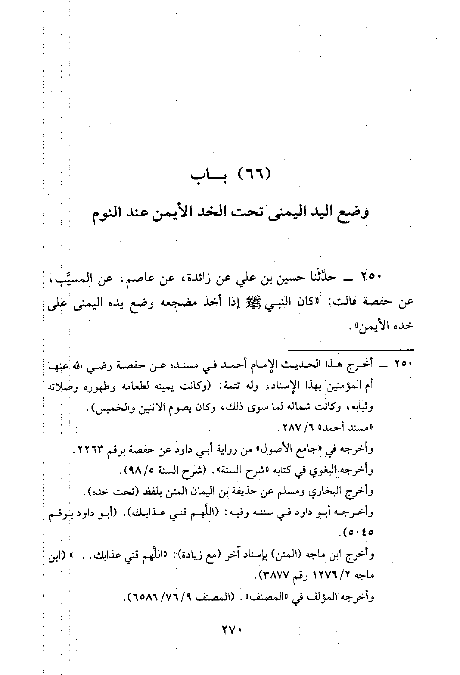 250 - حَدَّثَنَا حُسَيْنُ بْنُ عَلِيٍّ، عَنْ زَائِدَةَ، عَنْ عَاصِمٍ، عَنِ الْمُسَيِّبِ، عَنْ حَفْصَةَ، قَالَتْ: «كَانَ النَّبِيُّ صَلَّى اللهُ عَلَيْهِ وَسَلَّمَ §إِذَا أَخَذَ مَضْجَعَهُ وَضَعَ يَدَهُ الْيُمْنَى عَلَى خَدِّهِ الْأَيْمَنِ»