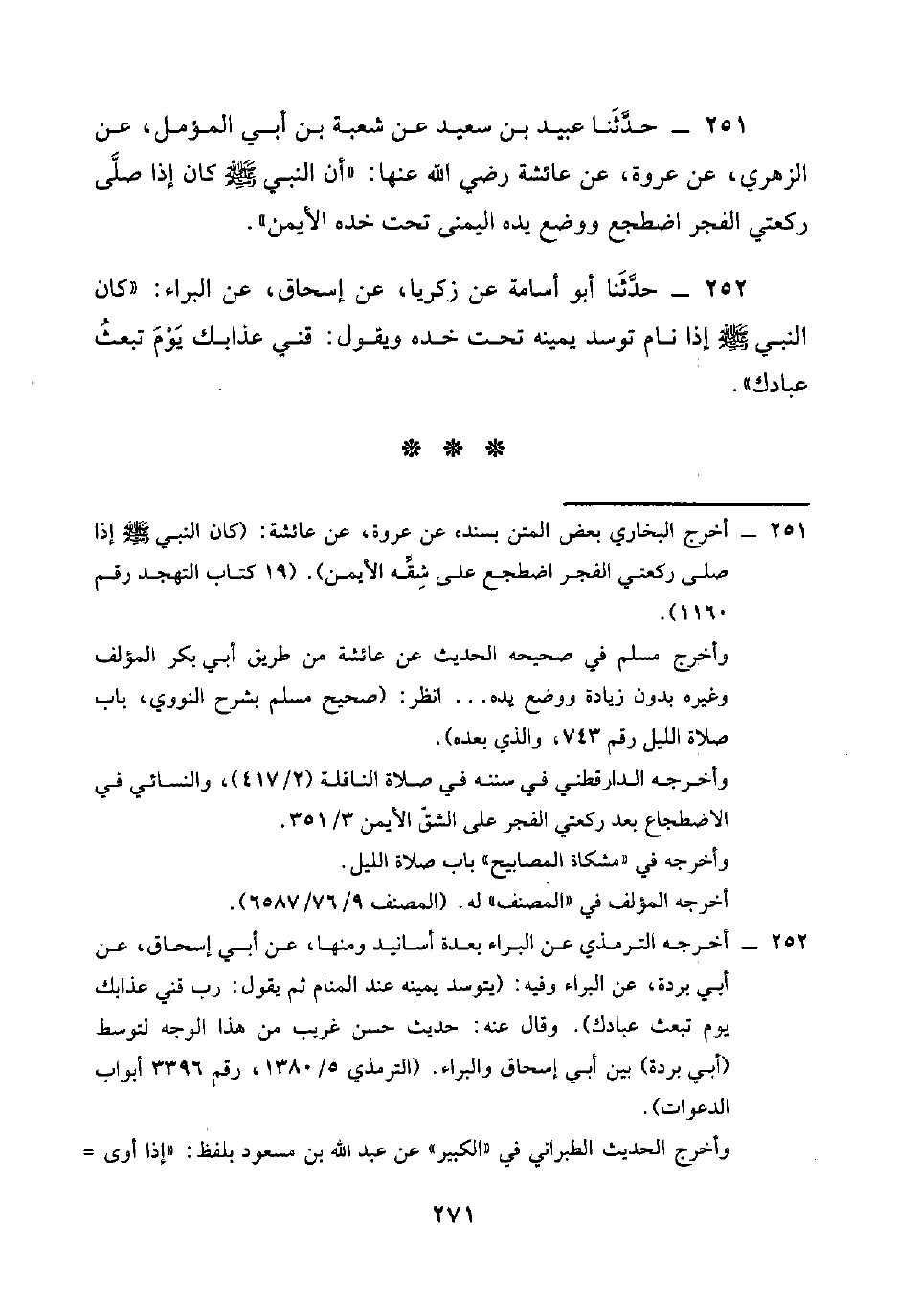 251 - حَدَّثَنَا عُبَيْدُ بْنُ سَعِيدٍ، عَنْ شُعْبَةَ عَنْ أَبِي الْمُؤَمَّلِ، عَنِ الزُّهْرِيِّ، عَنْ عُرْوَةَ، عَنْ عَائِشَةَ رَضِيَ اللَّهُ عَنْهَا: «أَنَّ النَّبِيَّ صَلَّى اللهُ عَلَيْهِ وَسَلَّمَ كَانَ §إِذَا صَلَّى رَكْعَتَيِ الْفَجْرِ اضْطَجَعَ، وَوَضَعَ يَدَهُ الْيُمْنَى تَحْتَ خَدِّهِ الْأَيْمَنِ»