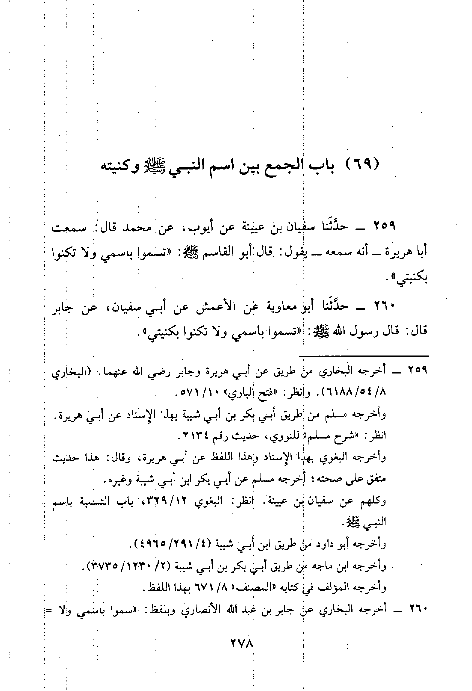 260 - حَدَّثَنَا أَبُو مُعَاوِيَةَ، عَنِ الْأَعْمَشِ، عَنْ أَبِي سُفْيَانَ، عَنْ جَابِرٍ، قَالَ: قَالَ رَسُولُ اللَّهِ صَلَّى اللهُ عَلَيْهِ وَسَلَّمَ: «§تَسَمَّوْا بِاسْمِي وَلَا تَكَنَّوْا بِكُنْيَتِي»