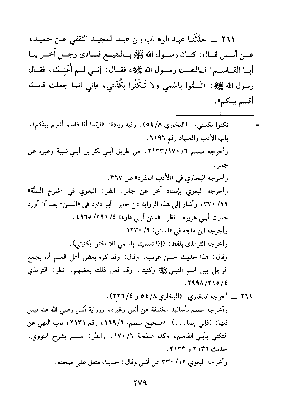 261 - حَدَّثَنَا عَبْدُ الْوَهَّابِ بْنُ عَبْدِ الْمَجِيدِ الثَّقَفِيُّ، عَنْ حُمَيْدٍ، عَنْ أَنَسٍ قَالَ: كَانَ رَسُولُ اللَّهِ صَلَّى اللهُ عَلَيْهِ وَسَلَّمَ بِالْبَقِيعِ، فَنَادَى رَجُلٌ آخَرَ: يَا أَبَا الْقَاسِمِ فَالْتَفَتَ رَسُولُ اللَّهِ صَلَّى اللهُ عَلَيْهِ وَسَلَّمَ، فَقَالَ: إِنِّي لَمْ أَعْنِكَ، فَقَالَ رَسُولُ اللَّهِ صَلَّى اللهُ عَلَيْهِ وَسَلَّمَ: «§تَسَمَّوْا بِاسْمِي وَلَا تَكَنَّوْا بِكُنْيَتِي، فَإِنِّي إِنَّمَا جُعِلْتُ قَاسِمًا أَقْسِمُ بَيْنَكُمْ»
