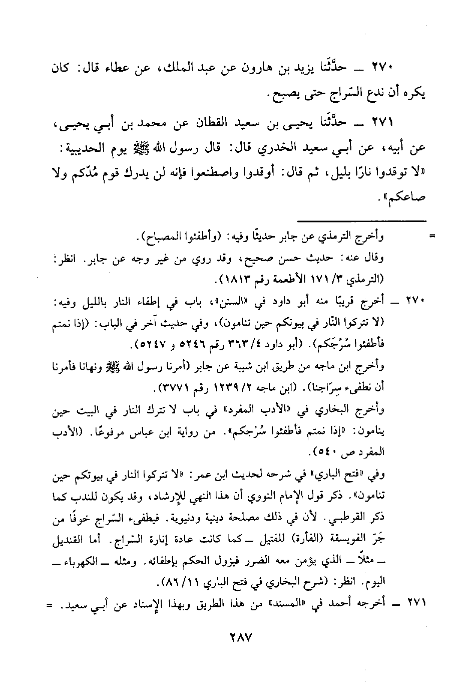 270 - حَدَّثَنَا يَزِيدُ بْنُ هَارُونَ، عَنْ عَبْدِ الْمَلِكِ، عَنْ عَطَاءٍ، قَالَ: «§كَانَ يُكْرَهُ أَنْ نَدَعَ السِّرَاجَ حَتَّى يُصْبِحَ»