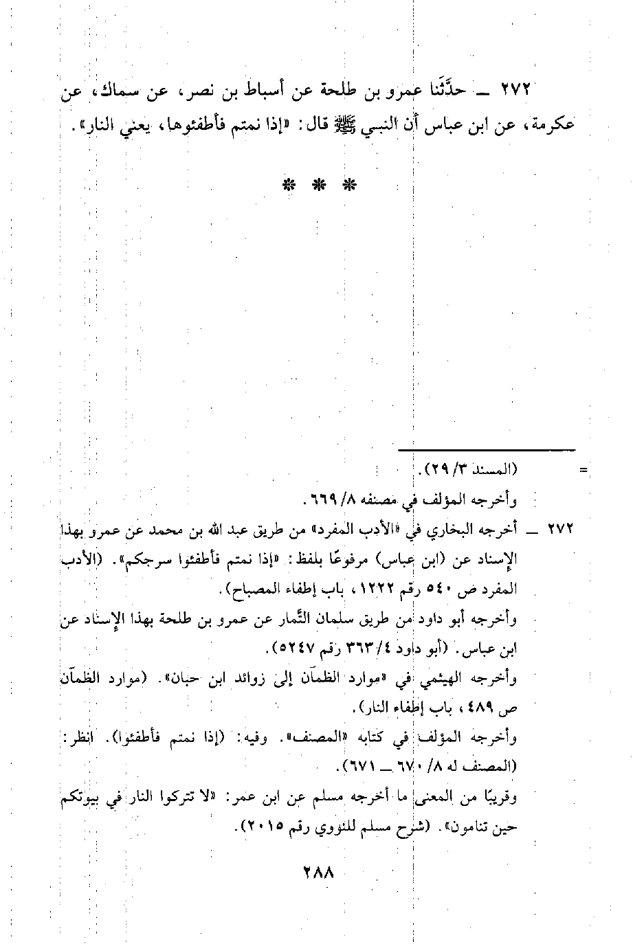 272 - حَدَّثَنَا عَمْرُو بْنُ طَلْحَةَ، عَنْ أَسْبَاطَ بْنِ نَصْرٍ، عَنْ سِمَاكٍ، عَنْ عِكْرِمَةَ، عَنِ ابْنِ عَبَّاسٍ، أَنَّ النَّبِيَّ صَلَّى اللهُ عَلَيْهِ وَسَلَّمَ، قَالَ: «§إِذَا نِمْتُمْ فَأَطْفِئُوهَا» ، يَعْنِي النَّارَ