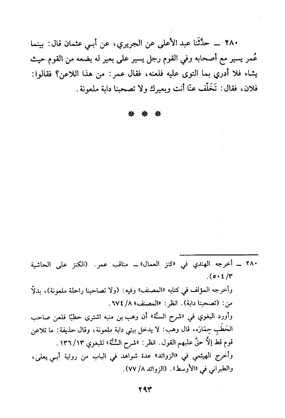 280 - حَدَّثَنَا عَبْدُ الْأَعْلَى، عَنِ الْجُرَيْرِيِّ، عَنْ أَبِي عُثْمَانَ قَالَ: بَيْنَمَا عُمَرُ يَسِيرُ مَعَ أَصْحَابِهِ وَفِي الْقَوْمِ رَجُلٌ يَسِيرُ عَلَى بَعِيرٍ لَهُ يَضَعُهُ مِنَ الْقَوْمِ حَيْثُ يَشَاءُ، فَلَا أَدْرِي بِمَا الْتَوَى عَلَيْهِ فَلَعَنَهُ، فَقَالَ عُمَرُ: «مَنْ هَذَا اللَّاعِنُ؟» ، فَقَالُوا: فُلَانٌ. فَقَالَ: «§تَخَلَّفْ عَنَّا أَنْتَ وَبَعِيرُكَ. وَلَا تَصْحَبْنَا دَابَّةٌ مَلْعُونَةٌ»