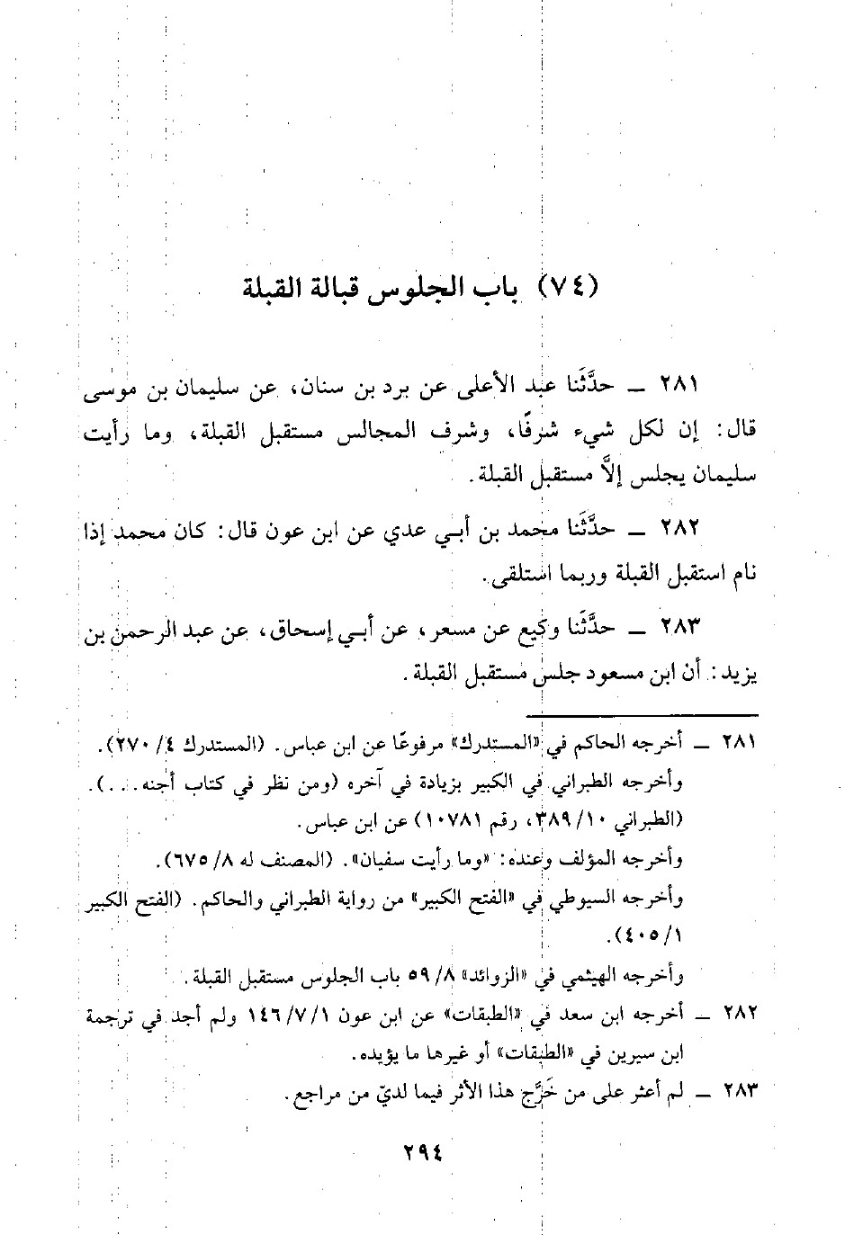 283 - حَدَّثَنَا وَكِيعٌ، عَنْ مِسْعَرٍ، عَنْ أَبِي إِسْحَاقَ، عَنْ عَبْدِ الرَّحْمَنِ بْنِ يَزِيدَ: «أَنَّ ابْنَ مَسْعُودٍ §جَلَسَ مُسْتَقْبِلَ الْقِبْلَةِ»