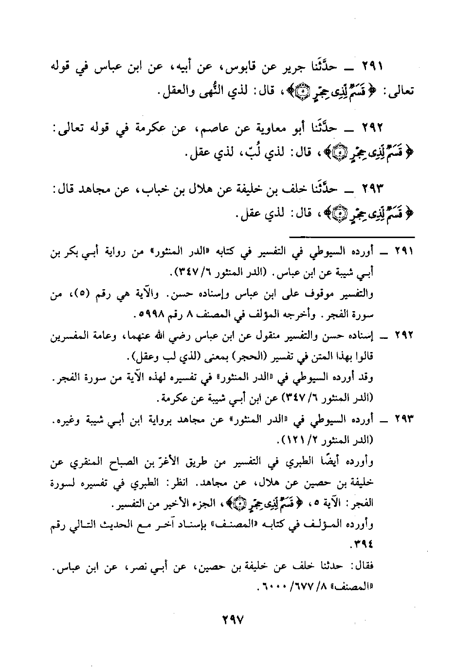 291 - حَدَّثَنَا جَرِيرٌ، عَنْ قَابُوسٍ، عَنْ أَبِيهِ، عَنِ ابْنِ عَبَّاسٍ فِي قَوْلِهِ تَعَالَى: {§قَسَمٌ لِذِي حِجْرٍ} [الفجر: 5] ، قَالَ: «لِذِي النُّهَى وَالْعَقْلِ»