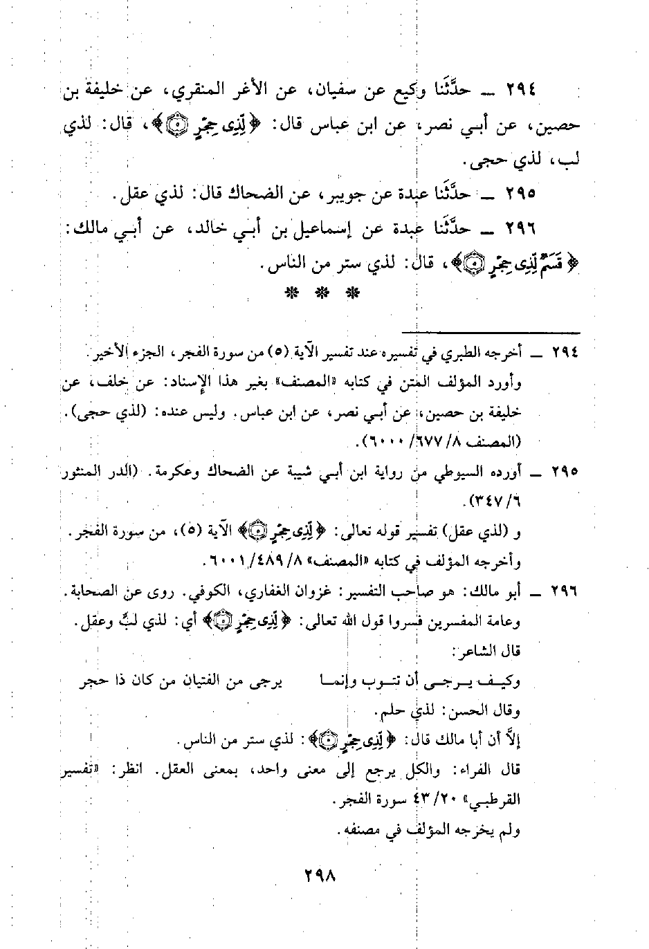 294 - حَدَّثَنَا وَكِيعٌ، عَنْ سُفْيَانَ، عَنِ الْأَغَرِّ الْمُنَقِّرِيِّ، عَنْ خَلِيفَةَ بْنِ حُصَيْنٍ، عَنْ أَبِي نَصْرٍ، عَنِ ابْنِ عَبَّاسٍ قَالَ: {§لِذِي حِجْرٍ} [الفجر: 5] ، قَالَ: «لِذِي لُبٍّ، لِذِي حِجَى»
