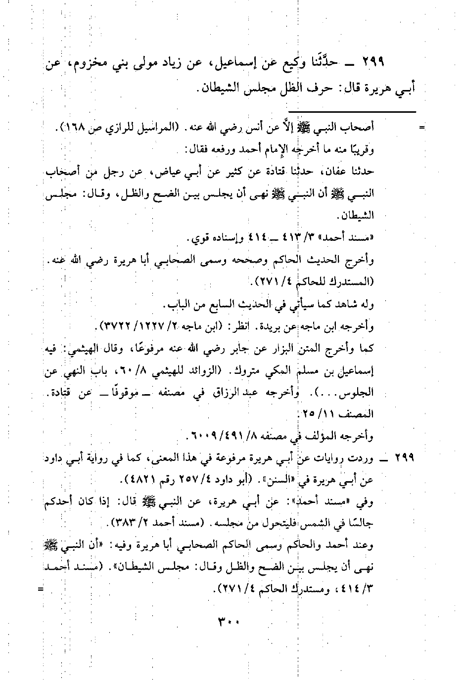 299 - حَدَّثَنَا وَكِيعٌ، عَنْ إِسْمَاعِيلَ، عَنْ زِيَادٍ مَوْلَى بَنِي مَخْزُومٍ، عَنْ أَبِي هُرَيْرَةَ، قَالَ: «§حَرْفُ الظِّلِّ مَجْلِسُ الشَّيْطَانِ»