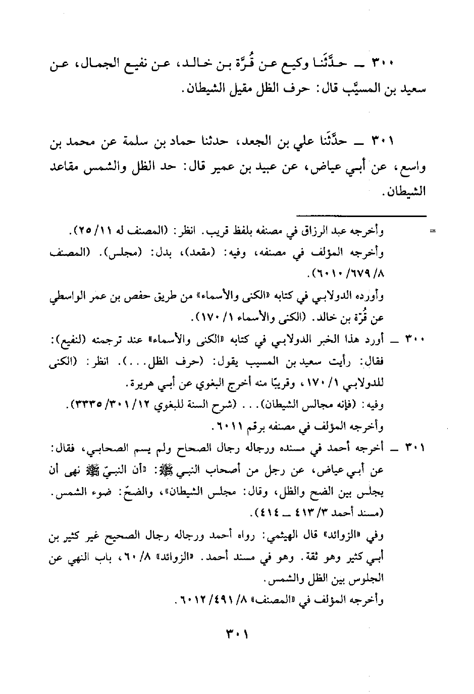 301 - حَدَّثَنَا عَلِيُّ بْنُ الْجَعْدٍ، حَدَّثَنَا حَمَّادُ بْنُ سَلَمَةَ، عَنْ مُحَمَّدِ بْنِ وَاسِعٍ، عَنْ أَبِي عِيَاضٍ، عَنْ عُبَيْدِ بْنِ عُمَيْرٍ، قَالَ: «§حَدُّ الظِّلِّ وَالشَّمْسِ مَقَاعِدُ الشَّيْطَانِ»