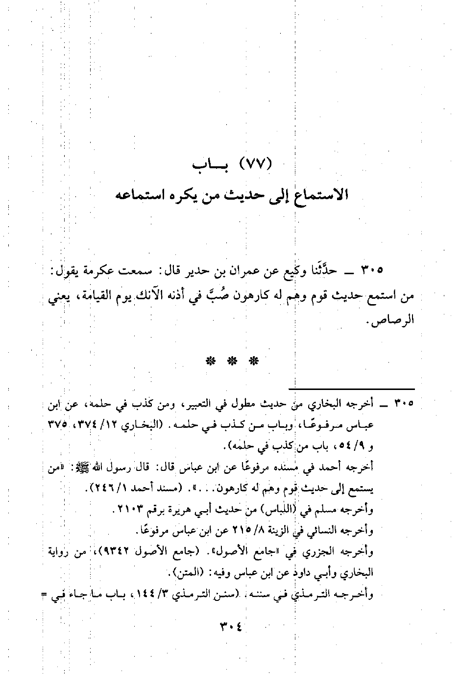 305 - حَدَّثَنَا وَكِيعٌ، عَنْ عِمْرَانَ بْنِ حُدَيْرٍ قَالَ: سَمِعْتُ عِكْرِمَةَ يَقُولُ: «§مَنِ اسْتَمَعَ حَدِيثَ قَوْمٍ وَهُمْ لَهُ كَارِهُونَ، صُبَّ فِي أُذُنِهِ الْآنُكَ يَوْمَ الْقِيَامَةِ» يَعْنِي الرَّصَاصَ
