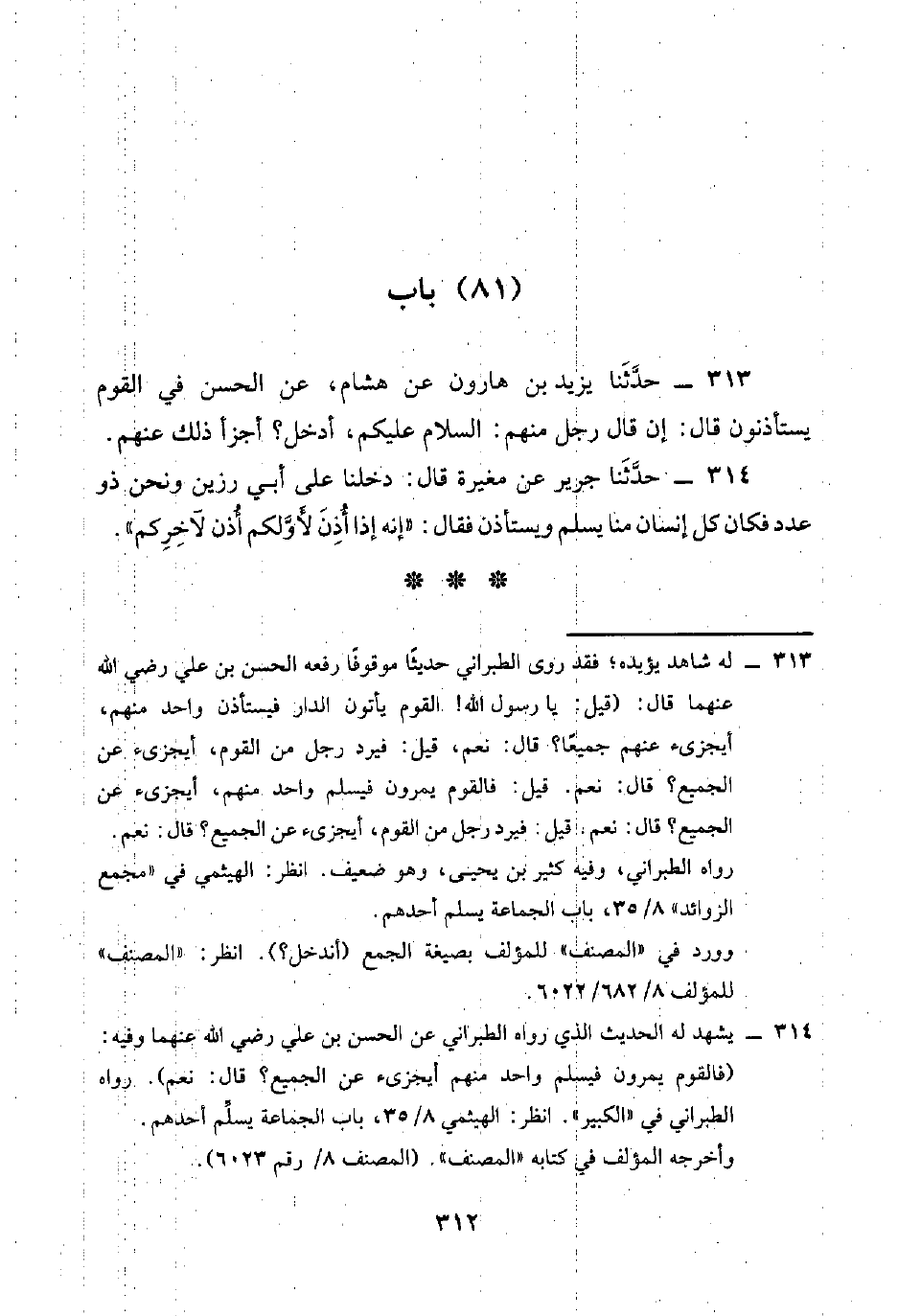 314 - حَدَّثَنَا جَرِيرٌ، عَنْ مُغِيرَةَ قَالَ: دَخَلْنَا عَلَى أَبِي رَزِينٍ وَنَحْنُ ذَوُو عَدَدٍ، فَكَانَ كُلُّ إِنْسَانٍ مِنَّا يُسَلِّمُ، وَيَسْتَأْذِنُ. فَقَالَ: «إِنَّهُ §إِذَا أُذِنَ لِأَوَّلِكُمْ أُذِنَ لِآخِرِكُمْ»