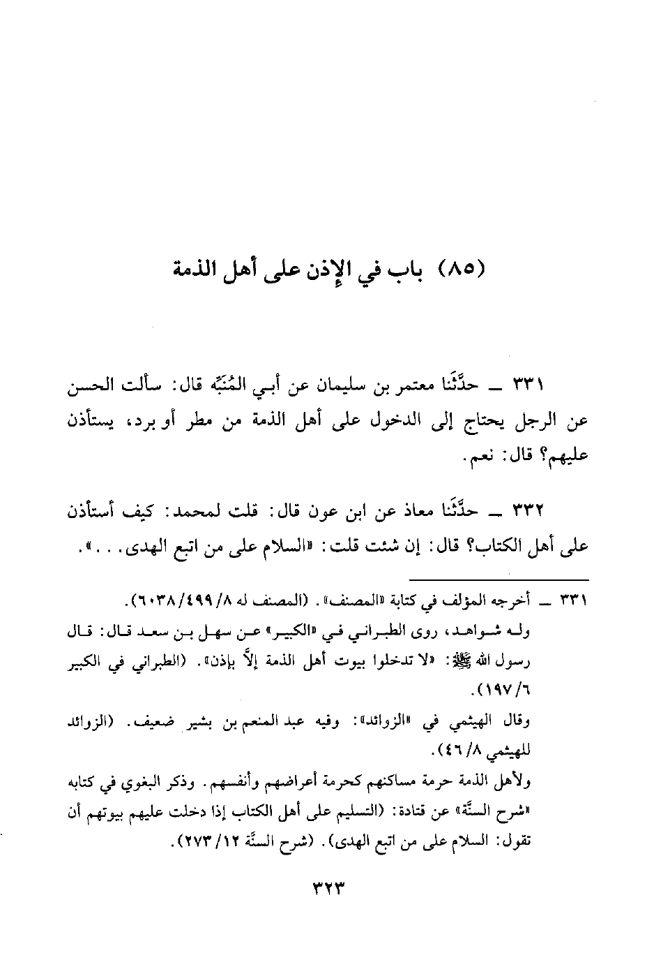 331 - حَدَّثَنَا مُعْتَمِرُ بْنُ سُلَيْمَانَ، عَنْ أَبِي الْمُنَبِّهِ، قَالَ: سَأَلْتُ الْحَسَنَ عَنِ §الرَّجُلِ يَحْتَاجُ إِلَى الدُّخُولِ عَلَى أَهْلِ الذِّمَّةِ مِنْ مَطَرٍ أَوْ بَرْدٍ، يَسْتَأْذِنُ عَلَيْهِمْ؟ قَالَ: «نَعَمْ»
