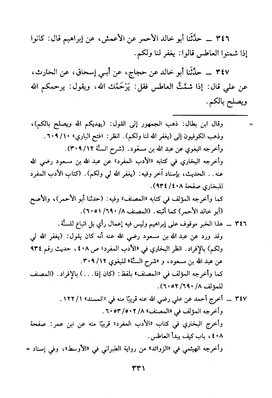 346 - حَدَّثَنَا أَبُو خَالِدٍ الْأَحْمَرُ، عَنِ الْأَعْمَشِ، عَنْ إِبْرَاهِيمَ، قَالَ: " كَانُوا §إِذَا شَمَّتُوا الْعَاطِسَ، قَالُوا: يَغْفِرُ لَنَا وَلَكُمْ "