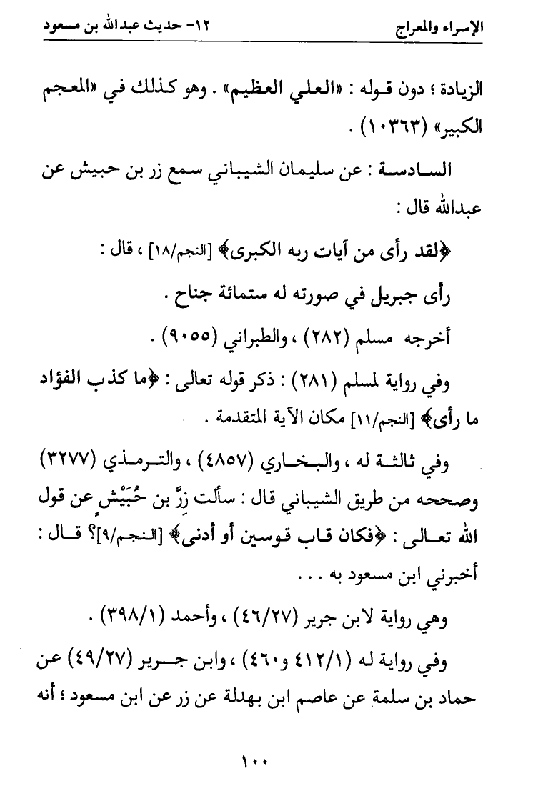 السادسة: عن سليمان الشيباني سمع زر بن حبيش عن عبد الله قال: {لَقَدْ رَأَى مِنْ آيَاتِ رَبِّهِ الْكُبْرَى} [النجم/18] قال: رأى جبريل في صورته له ستمائة جناح.