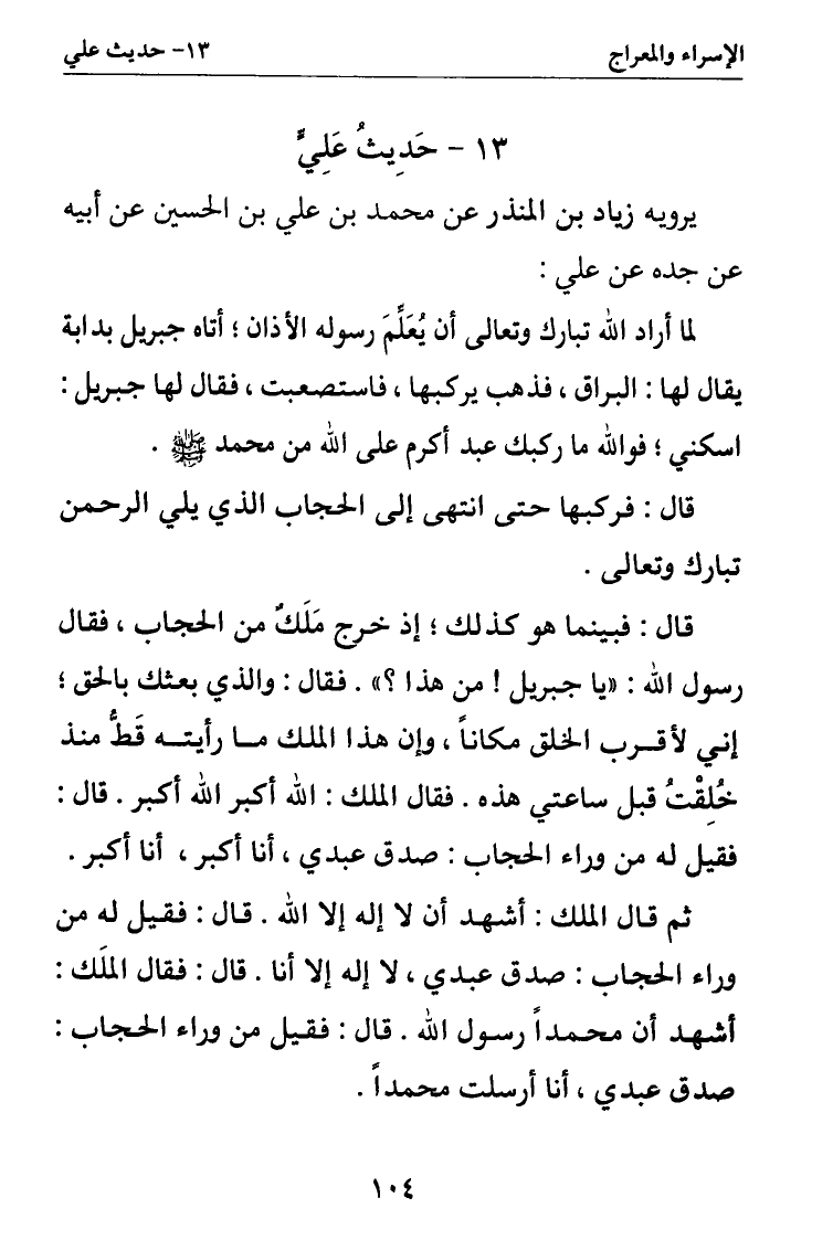 يرويه زياد بن المنذر عن محمد بن علي بن الحسين عن أبيه عن جده عن علي: لما أراد الله تبارك وتعالى أن يعلم رسوله الأذان أتاه جبريل بدابة يقال لها: البراق فذهب يركبها فاستصعبت فقال لها جبريل: اسكني فوالله ما ركبك عبد أكرم على الله من محمد صلى الله عليه وسلم.