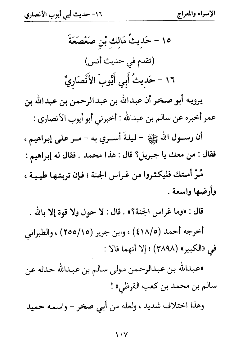 يرويه أبو صخر أن عبد الله بن عبد الرحمن بن عبد الله بن عمر أخبره عن سالم بن عبد الله: أخبرني أبو أيوب الأنصاري: أن رسول الله صلى الله عليه وسلم - ليلة أسري به - مر على إبراهيم فقال: من معك يا جبريل؟ قال: هذا محمد. فقال له إبراهيم: مر أمتك فليكثروا من غراس الجنة فإن تربتها طيبة وأرضها واسعة. قال: "وما غراس الجنة؟ ". قال: لا حول ولا قوة إلا بالله.