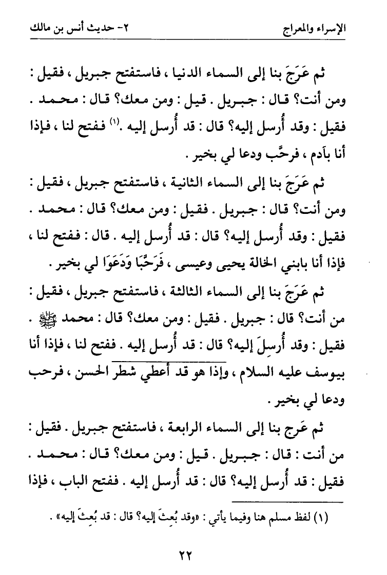 ثم عرج بنا إلى السماء الرابعة فاستفتح جبريل. فقيل: من أنت: قال: جبريل. قيل: ومن معك؟ قال: محمد. فقيل: قد أرسل إليه؟ قال: قد أرسل إليه. ففتح الباب فإذا