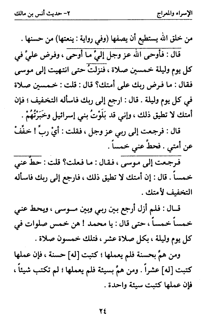 قال: فلم أزل أرجع بين ربي وبين موسى ويحط عني خمسا خمسا حتى قال: يا محمد! هن خمس صلوات في كل يوم وليلة بكل صلاة عشر فتلك خمسون صلاة.
