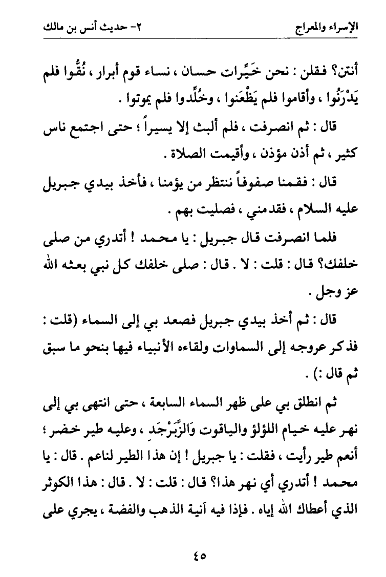 قال: ثم أخذ بيدي جبريل فصعد بي إلى السماء قلت: فذكر عروجه إلى السماوات ولقاءه الأنبياء فيها بنحو ما سبق ثم قال: ثم انطلق بي على ظهر السماء السابعة حتى انتهى بي إلى نهر عليه خيام اللؤلؤ والياقوت والزبرجد وعليه طير خضر أنعم طير رأيت فقلت: يا جبريل! إن هذا الطير لناعم. قال: يا محمد أتدري أي نهر هذا؟ قال: قلت: لا. قال: هذا الكوثر الذي أعطاك الله إياه. فإذا فيه آنية الذهب والفضة يجري على