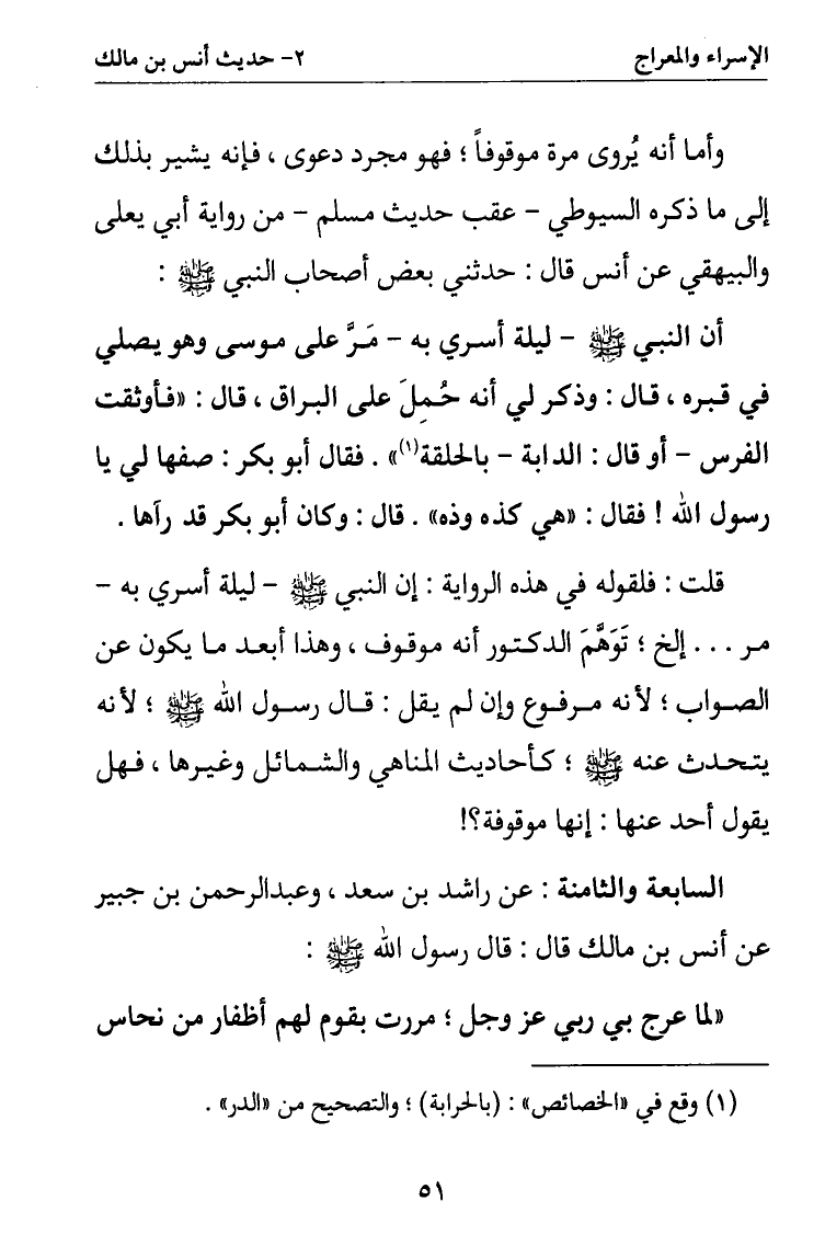 قلت: فلقوله في هذه الرواية: إن النبي صلى الله عليه وسلم - ليلة أسري به - مر ... إلخ توهم الدكتور أنه موقوف وهذا أبعد ما يكون عن الصواب لأنه مرفوع وإن لم يقل: قال رسول الله صلى الله عليه وسلم لأنه يتحدث عنه صلى الله عليه وسلم كأحاديث المناهي والشمائل وغيرها فهل يقول أحد عنها: إنها موقوفة؟!