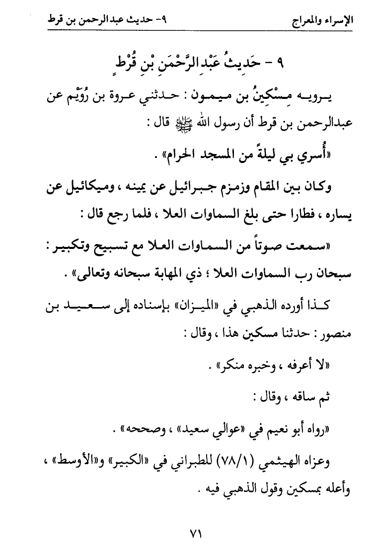 يرويه مسكين بن ميمون: حدثني عروة بن رويم عن عبد الرحمن بن قرط أن رسول الله صلى الله عليه وسلم قال: "أسري بي ليلة من المسجد الحرام".