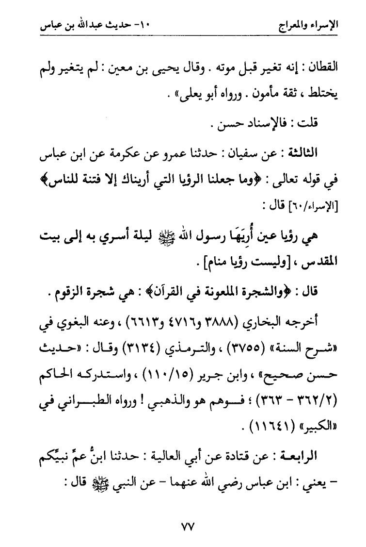 الثالثة: عن سفيان: حدثنا عمرو عن عكرمة عن ابن عباس في قوله تعالى: {وَمَا جَعَلْنَا الرُّؤْيا الَّتِي أَرَيْنَاكَ إِلَّا فِتْنَةً لِلنَّاسِ} [الإسراء/60] قال: هي رؤيا عين أريها رسول الله صلى الله عليه وسلم ليلة أسري به إلى بيت المقدس [وليست رؤيا منام] .