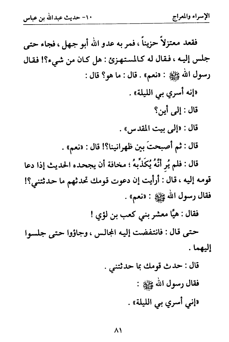 فقعد معتزلا حزينا فمر به عدو الله أبو جهل فجاء حتى جلس إليه فقال له كالمستهزئ: هل كان من شيء؟! فقال رسول الله صلى الله عليه وسلم: "نعم". قال: ما هو؟ قال: "إنه أسري بي".