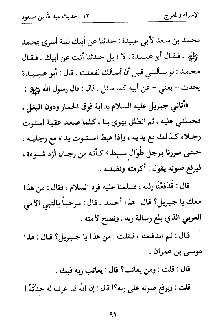 محمد بن سعد لأبي عبيدة: حدثنا عن أبيك ليلة أسري بمحمد صلى الله عليه وسلم. فقال أبو عبيدة: لا بل حدثنا أنت عن أبيك. فقال محمد: لو سألتني قبل أن أسألك لفعلت. قال: أبو عبيدة يحدث - يعني - عن أبيه كما سئل قال: قال رسول الله صلى الله عليه وسلم: "أتاني جبريل عليه السلام بدابة فوق الحمار ودون البغل فحملني عليه ثم انطلق يهوي بنا كلما صعد عقبة استوت رجلاه كذلك مع يديه وإذا هبط استوت يداه مع رجليه حتى مررنا برجل طوال سبط كأنه من رجال أزد شنوءة فيرفع صوته يقول: أكرمته وفضلته.