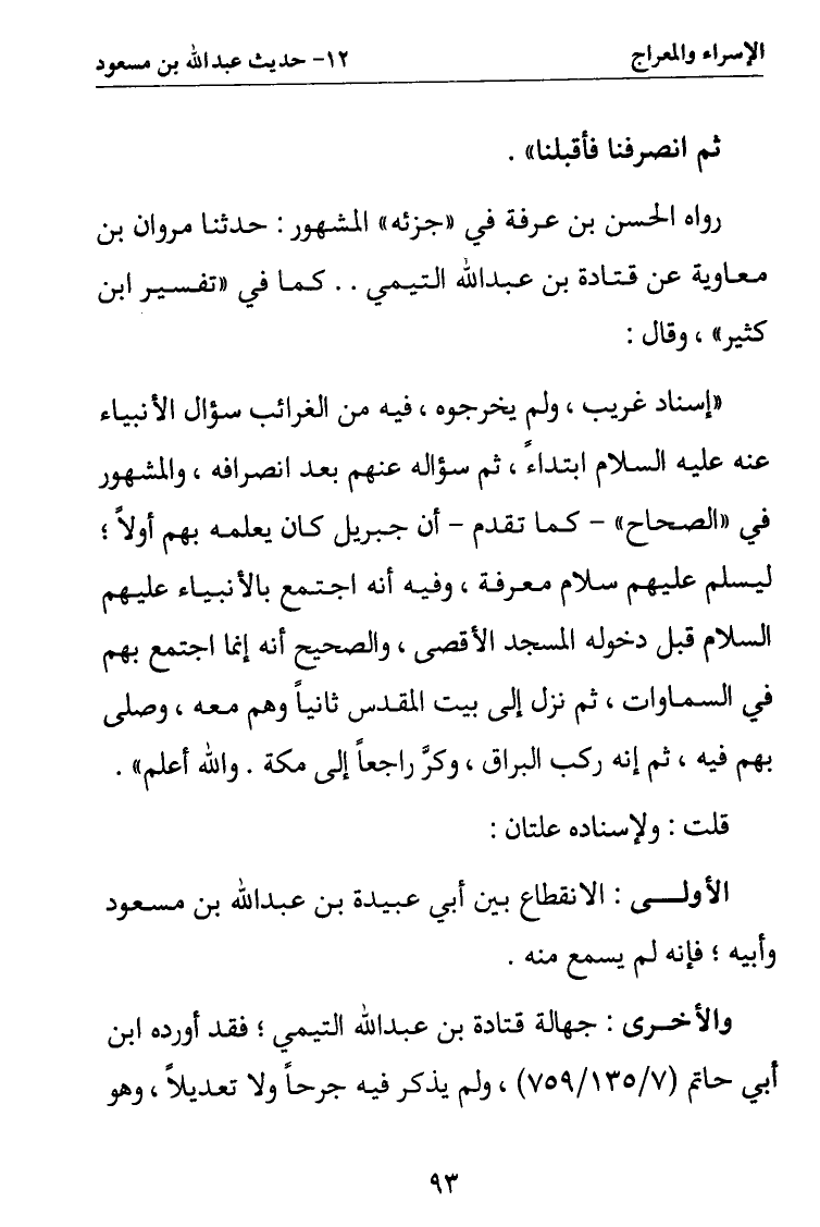 رواه الحسن بن عرفة في جزئه المشهور: حدثنا مروان بن معاوية عن قتادة بن عبد الله التيمي..كما في "تفسير ابن كثير" وقال: "إسناد غريب ولم يخرجوه فيه من الغرائب سؤال الأنبياء عنه عليه السلام ابتداء ثم سؤاله عنهم بعد انصرافه والمشهور في الصحاح - كما تقدم - أن جبريل كان يعلمه بهم أولا ليسلم عليهم سلام معرفة وفيه أنه اجتمع بالأنبياء عليهم السلام قبل دخوله المسجد الأقصى والصحيح أنه إنما اجتمع بهم في السماوات ثم نزل إلى بيت المقدس ثانيا وهم معه وصلى بهم فيه ثم إنه ركب البراق وكر راجعا إلى مكة. والله أعلم".